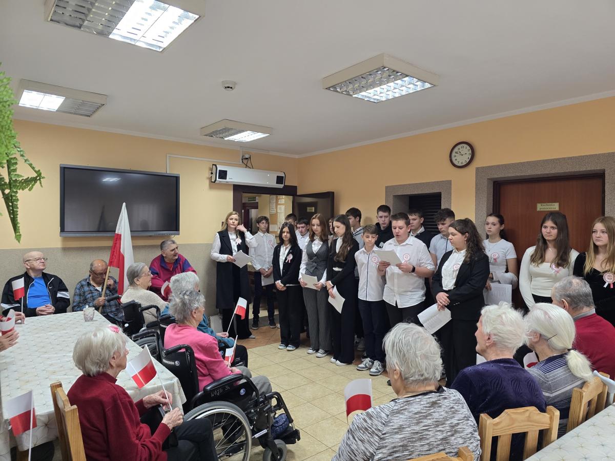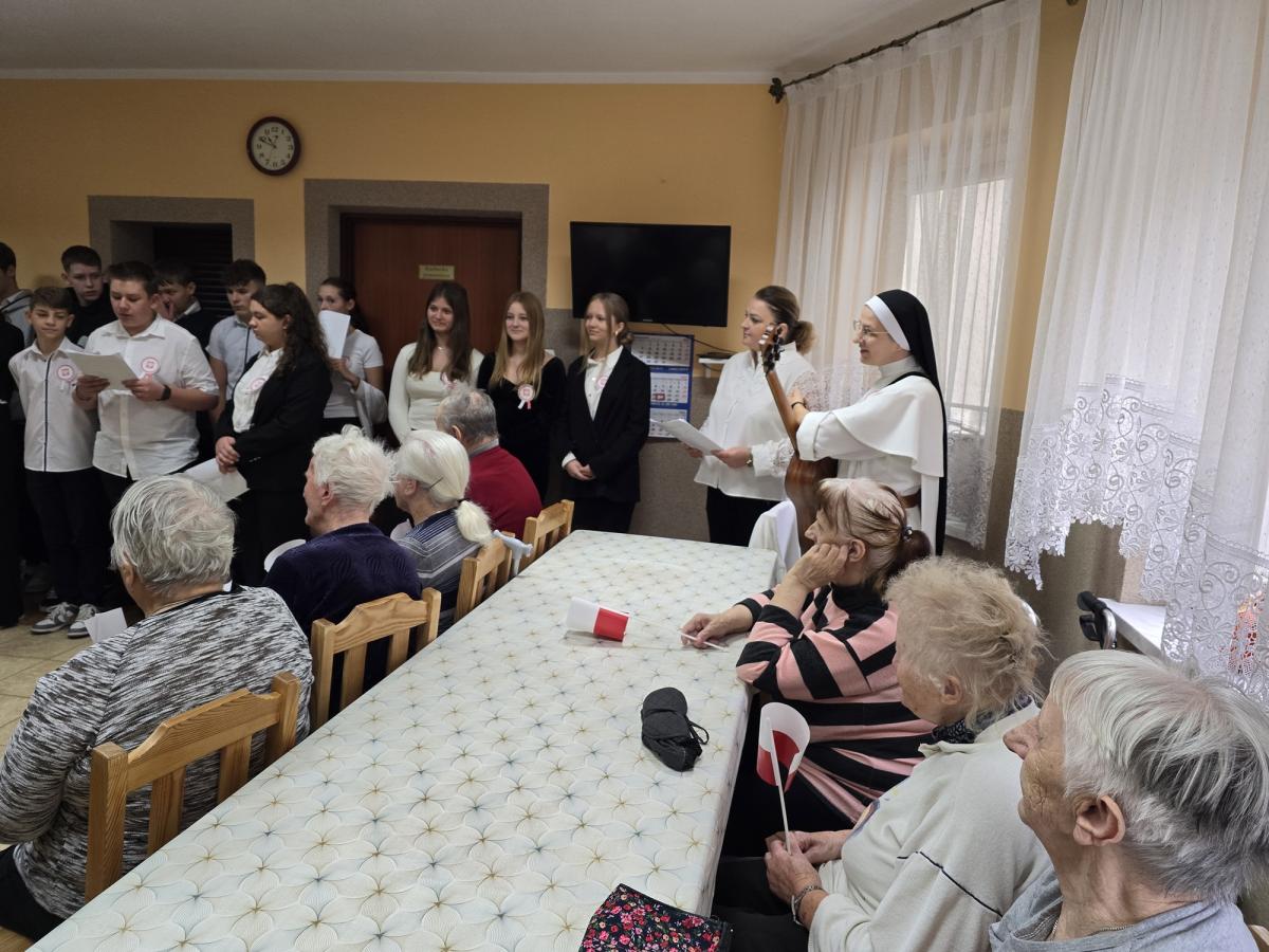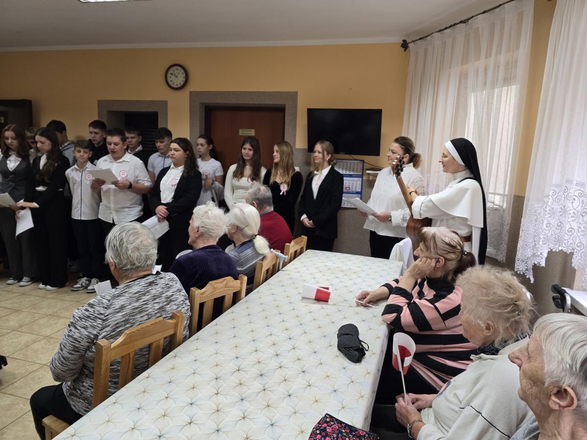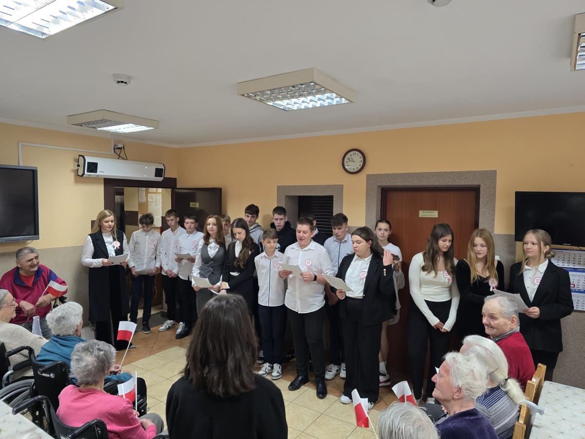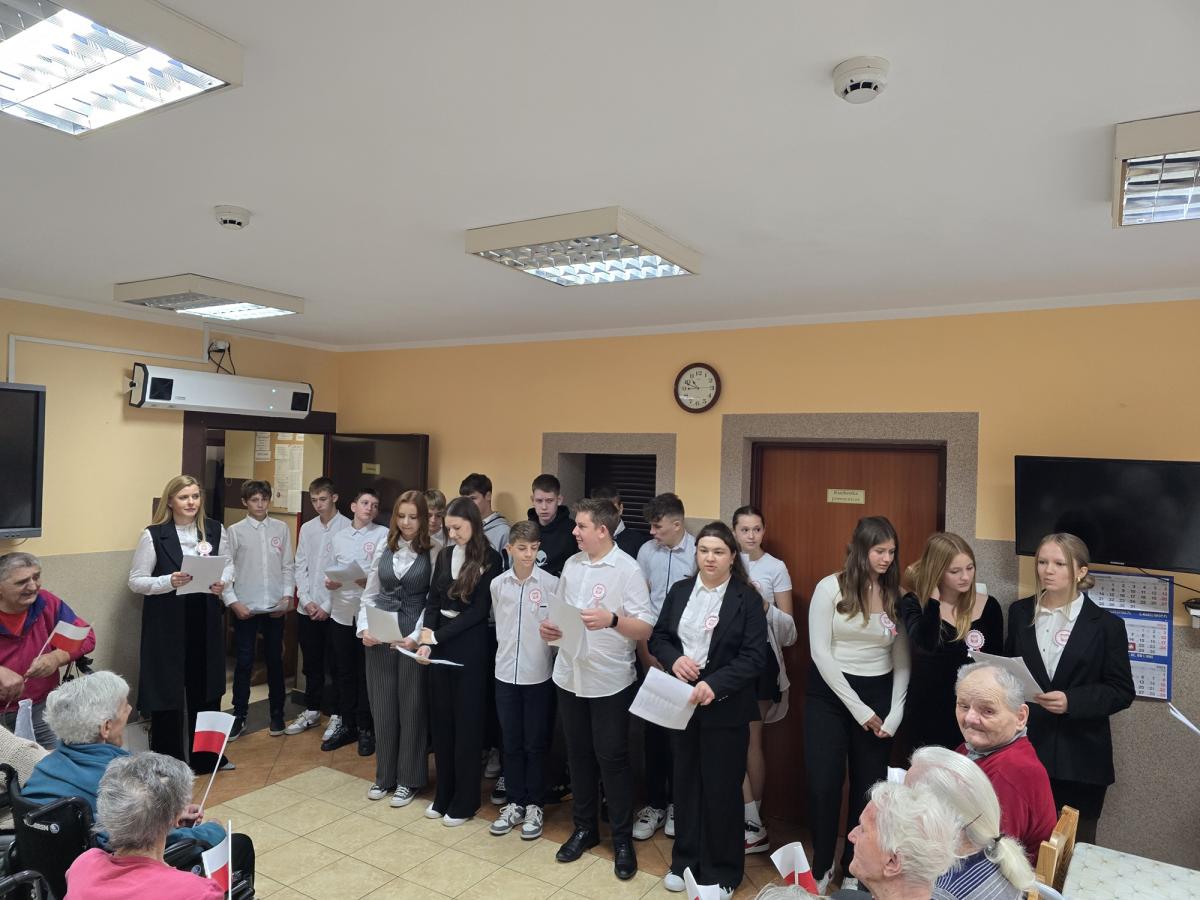 W piątek (8 listopada br.) młodzież klasy ósmej z Zespołu Szkolno-Przedszkolnego w Białej Niżnej wraz z nauczycielami odwiedziła naszych Mieszkańców z akademią przygotowaną na tę okazję. Głośny śpiew pieśni patriotycznych rozlegał się po całym Domu. Dziękujemy za te chwile wzruszeń i pamięć o naszych bohaterach.