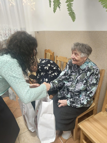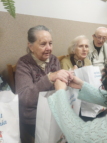 Seniorzy z Domu Pomocy Społecznej w Białej Niżnej z paczkami świątecznymi od Fundacji Biedronki.